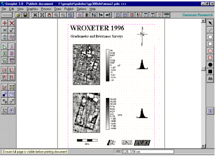 Once you have processed your data and set the graphics plotting parameters you can save this image, along with scale bars, north direction and histogram for use in the publishing mode. This mode allows you to tailor the printout to your own requirements, rather than using the default presentation of the standard graphics view, allowing you, for example, to choose a border and add text in various fonts and sizes, select a north direction symbol. Images may be positioned, rotated and scaled to your liking. More than one image can be incorporated in the document, for example images from different sites, different graphics types (eg shade and trace plots) and even your own logo. The published graphics image is not just a screen grab with limited resolution, but a properly regenerated plot showing full detail on large size printers.
